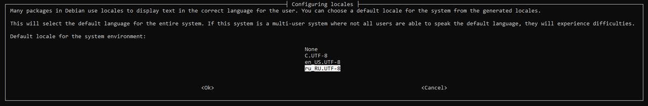 Дальше, чтобы включить поддержку кириллицы, выберите ru_RU.UTF-8.