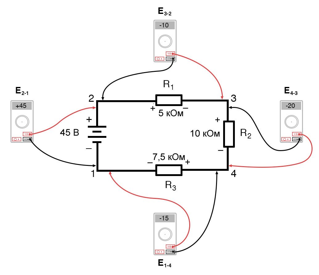 - Отобрать напряжения с одинаковым направлением обхода закрытого контура.