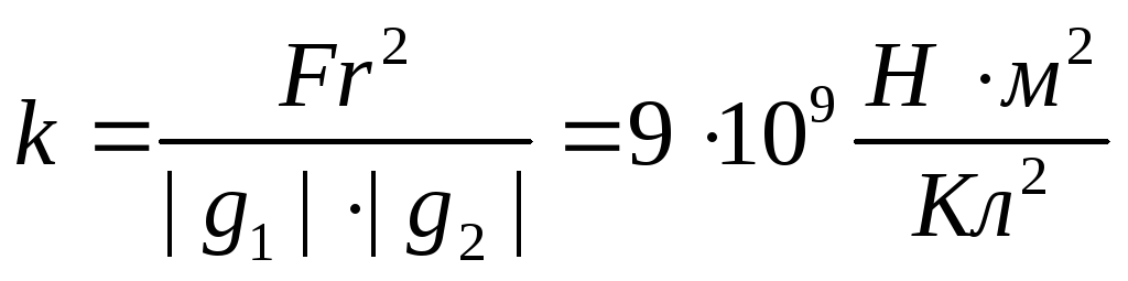 Коэффициент k в законе Кулона при его записи в СИ выражается в Н · м 2 /Кл 2 . Его численное значение, определенное экспериментально по силе взаимодействия двух известных зарядов, находящихся на заданном расстоянии, составляет: