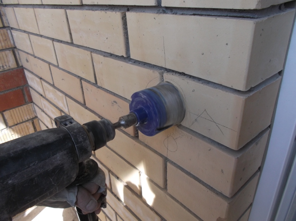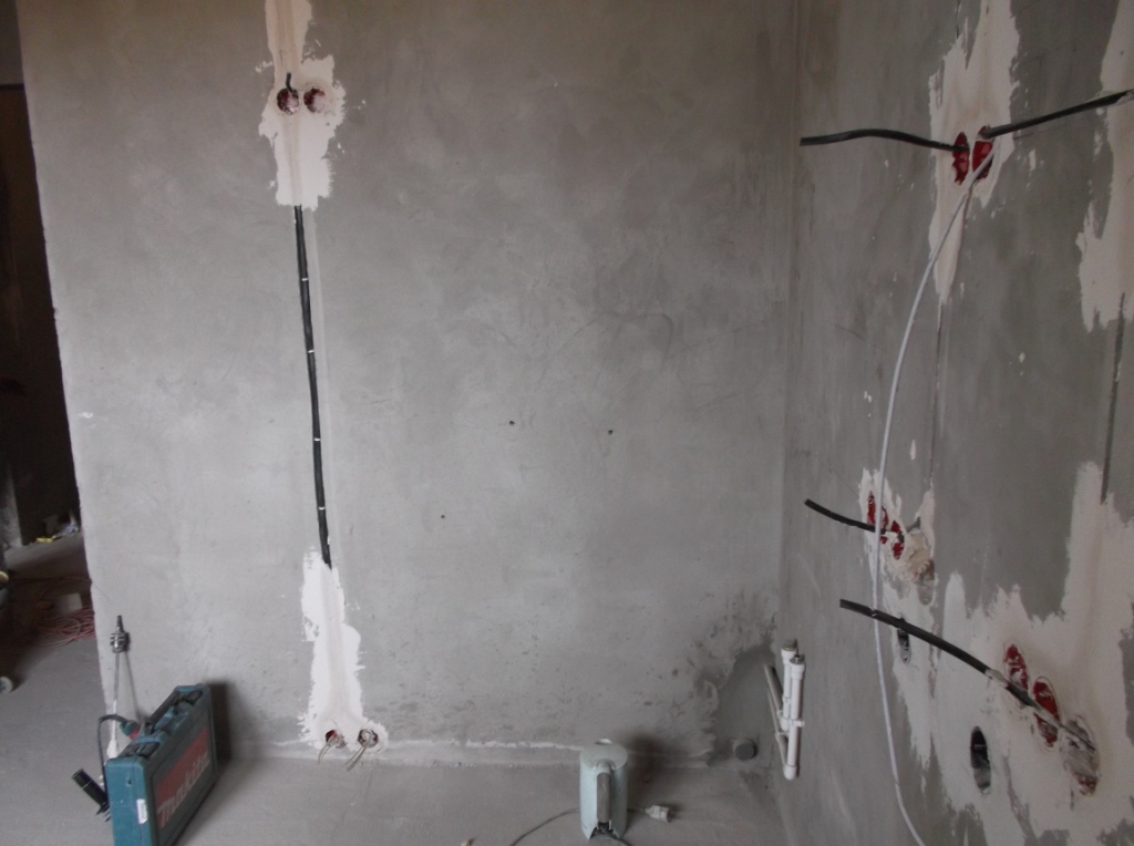 Коронкой по бетону на 70мм или 68мм (насадка на перфоратор), просверливаются отверстия для подрозетников. Штроборезом или болгаркой выпиливаются штробы для укладки кабеля. Штробы в стенах должны быть строго вертикальными, а не горизонтальными или по диагонали. Линии от розеток к щитку укладываются в стяжке пола или по потолку.