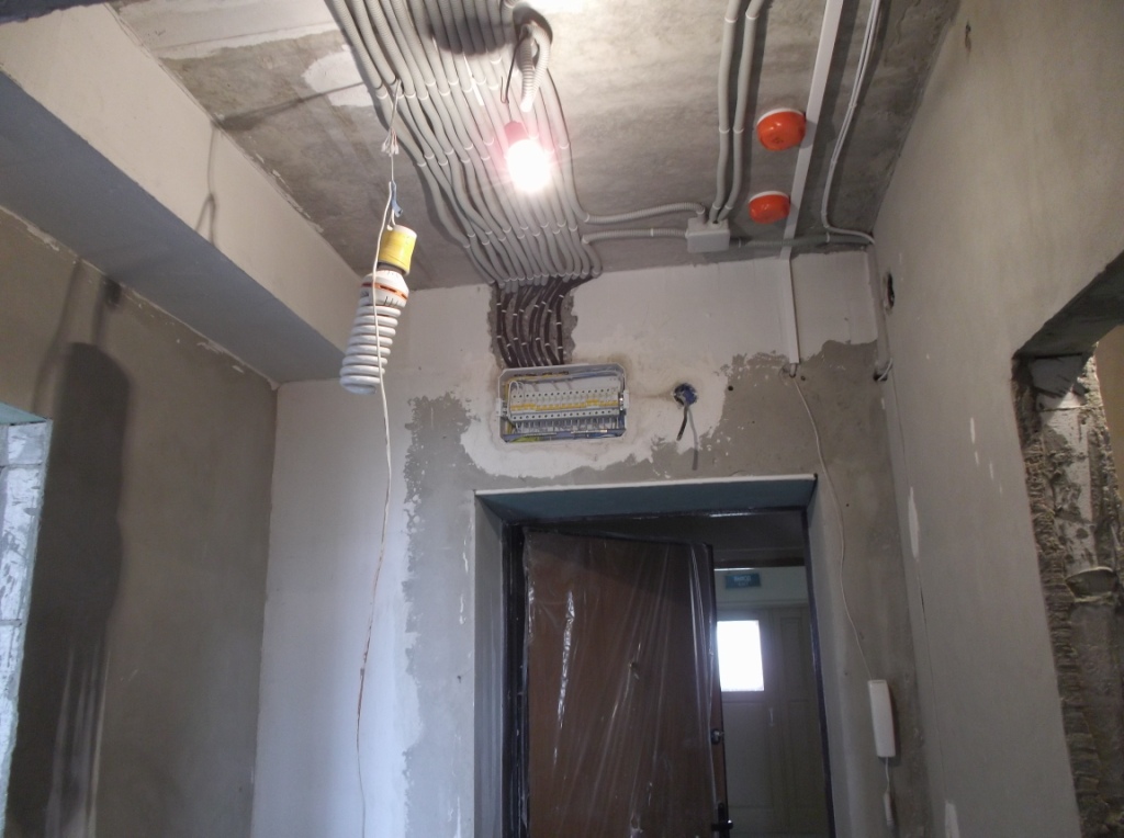 В прихожей два выключателя (прихожая и ванная), две розетки на всякий случай, розетка для роутера, распределительный щиток. Также были просверлены отверстия в подъезд для тв провода, ввода интернет провода и силового кабеля.
