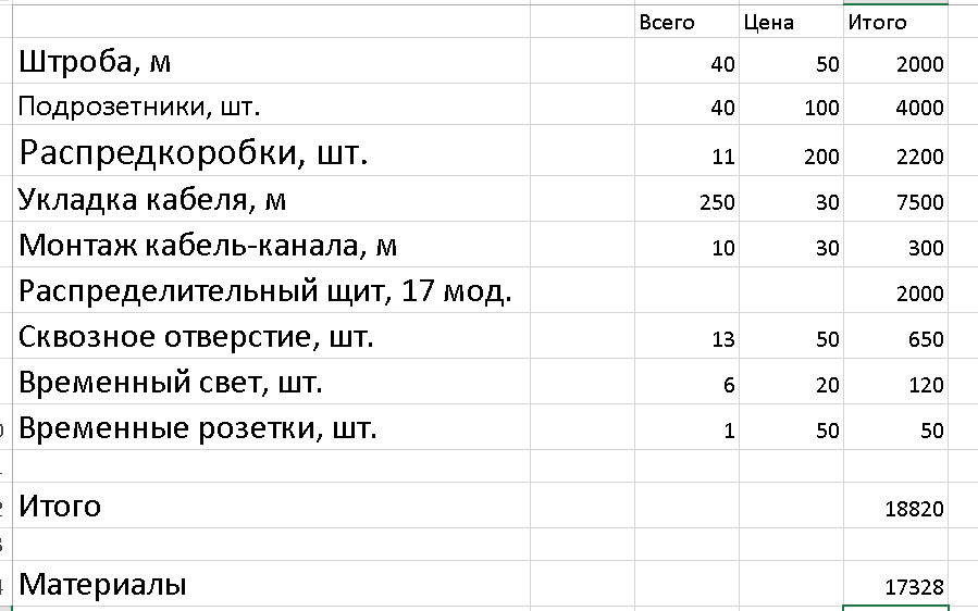 С работой также цены различны. Есть бригады, которые работают за фиксированную цену — таких в столичных регионах основное количество. Например — за «трешку» работа под ключ будет стоить в районе 60 – 70 000 рублей. Если повезет — то можете найти в 50 000 рублей, но опять же нужно спросить квалификацию, а то такие мастера вам наделают! В регионах нормальная цена, опять же за «трешку» в 40 — 50 000 рублей. Сюда входит и освещение и розетки и щиток с автоматами.