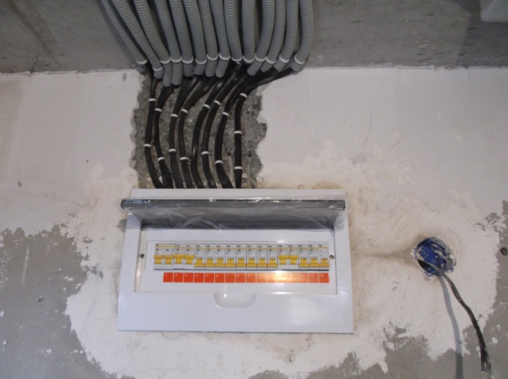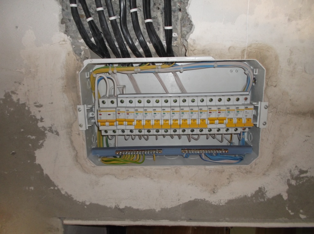 Монтаж щита можно перенести в любой временной интервал во время замены проводки. Лучше всего производить монтаж щита после черновой отделки (например отштукатуривания стен). Сборка щита производится в любое время, но перед установкой розеток и выключателей, для удобства пуско-наладочных работ.