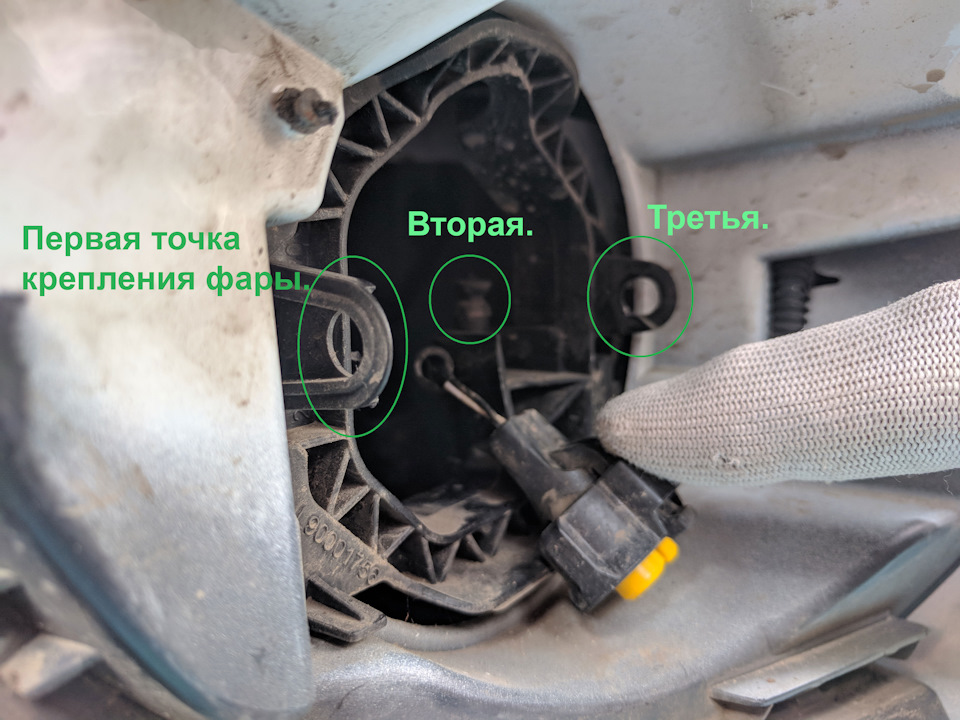 Вид посадочного места фары при снятой фаре.Внимание! Проводок с жёлтым креплением придерживайте пальцем! Иначе провод утянет его и он упадёт внутрь машины, куда руками не добраться. У нас такое случилось и пришлось из подручного провода делать крючок и долго терпеливо его вылавливать из темноты