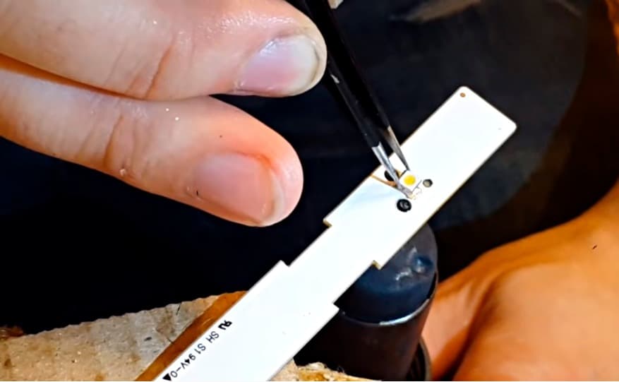Впаиваем новые светодиоды вместо неисправных. Для этого разогреваем припой на планке феном, затем прикладываем новый светодиод.