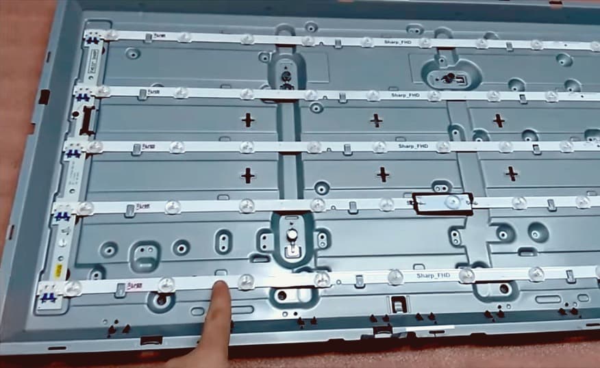 Крепим планки с заменёнными диодами к корпусу с помощью двухстороннего скотча. После чего проверяем подсветку и собираем телевизор в обратном порядке.