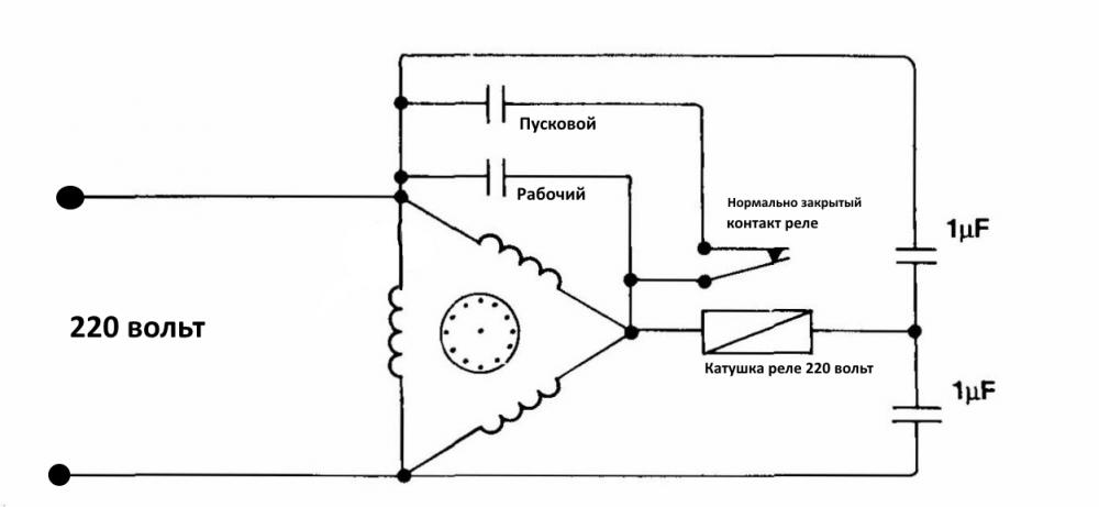 Небольшое напоминание, что конденсатор с меньшей мощностью, пусковой, будет включаться на небольшой промежуток времени для увеличения пускового момента. Кстати модно использовать механический выключатель, который пользователь сам будет включать на заданное время.