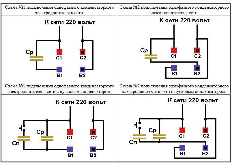 Разберем схемы подключения электродвигателя на для обоих случаев: Схемы подключения электродвигателя через конденсатор.