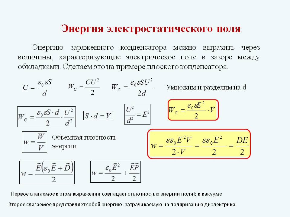 энергия конденсатора прямо пропорциональна напряженности электрического поля внутри него: Wp~E2. Детальный расчет дает следующее значение для энергии поля, приходящейся на единицу объема, т.е. для плотности энергии: