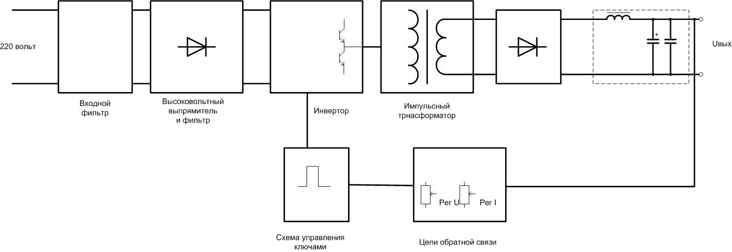 Обобщенная блок-схема импульсного БП.