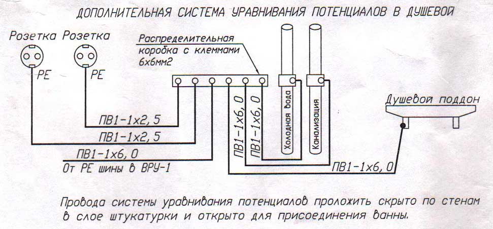 - и, наконец, оно выравнивает потенциал всех металлических предметов в ванной, подключенных к общему для дома заземляющему устройству (ЗУ).