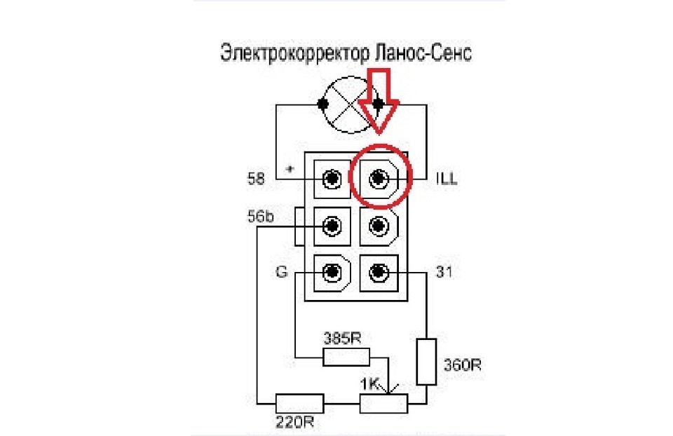 Остался +12 при включении габаритов. С ним все просто, снимаем фишку с корректора фар, находим нужный пин, который на схеме обозначен «ILL», и сюда подключаем канал 58 зуммера.